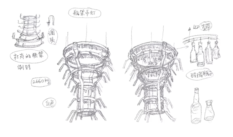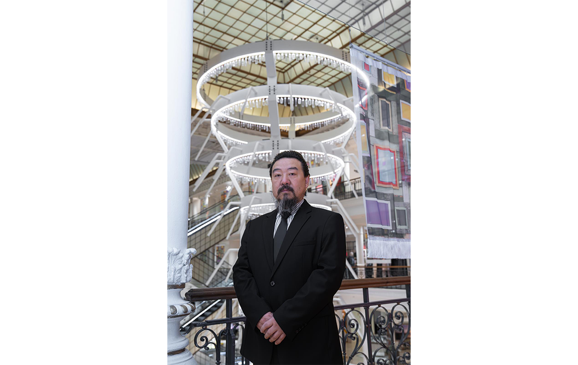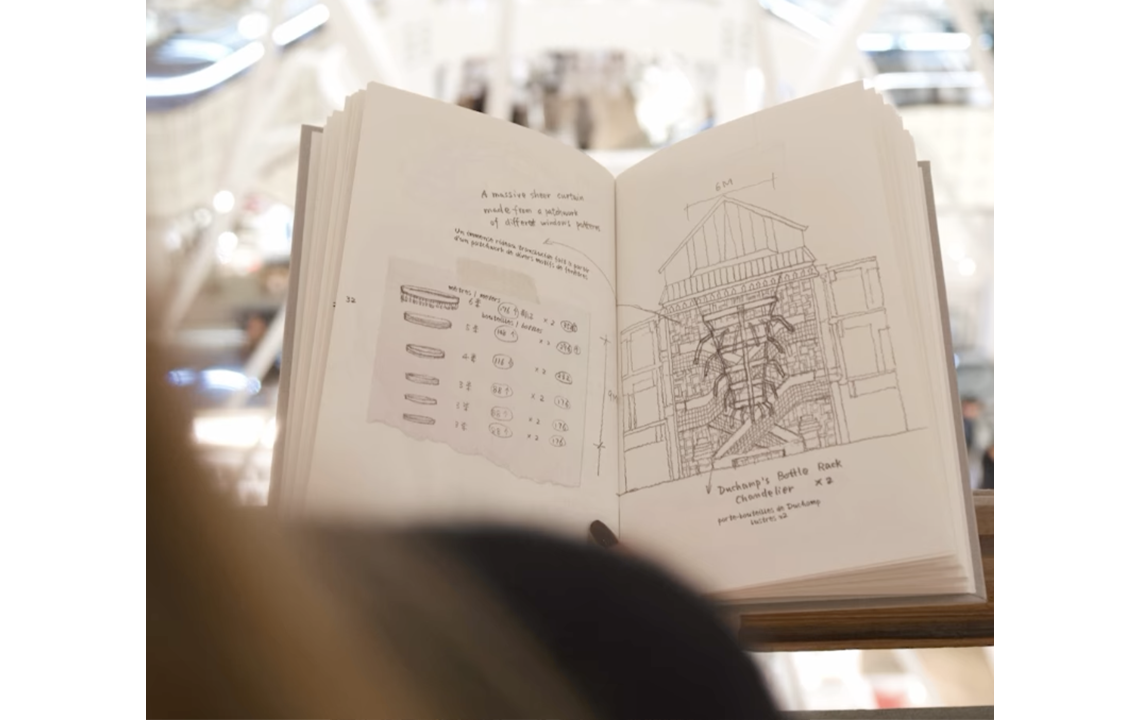 Around the central escalator, Song Dong unveils two monumental chandeliers, suspended under the glass roofs and composed of six steel rings, adorned with bottles lit with white lights, evoking the sparkling pendants of a chandelier. Along the guardrails of the two openings, the artist has installed a set of curtains featuring his iconic motif of coloured windows.