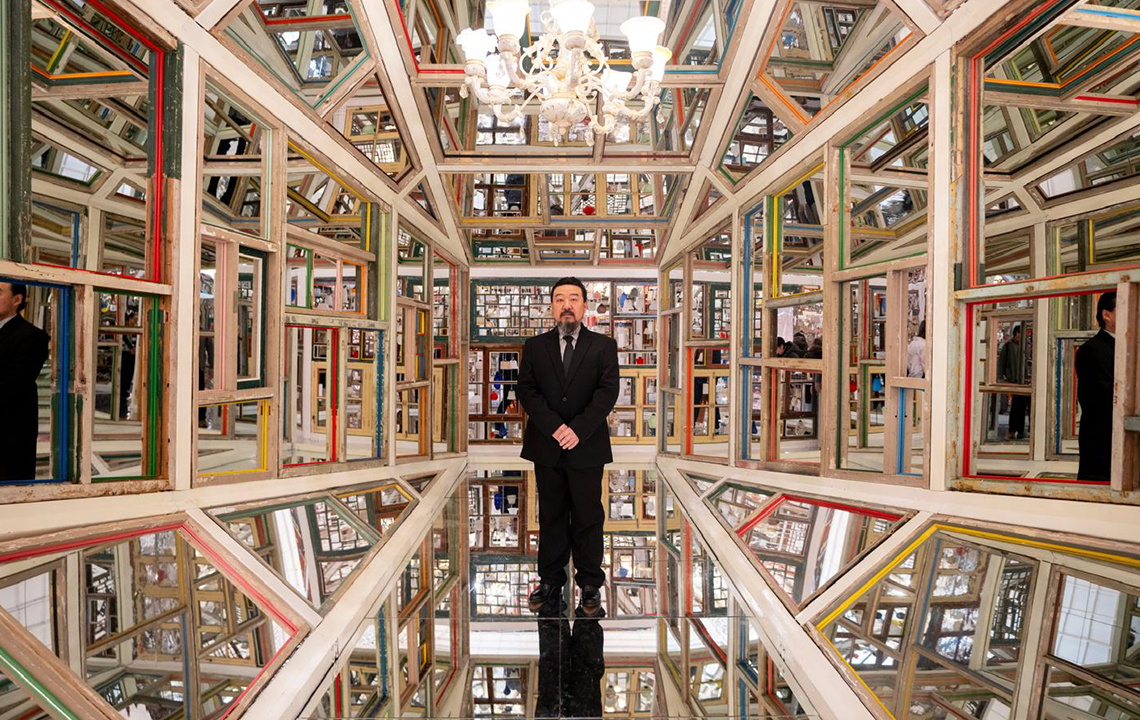 On the second floor, the artist has designed an immersive hall of mirrors composed of two installations built from coloured doors and windows: a house illuminated by hundreds of lamps from his personal collection and a giant kaleidoscope, which offers a breathtaking view of the installations suspended under the glass roofs.
